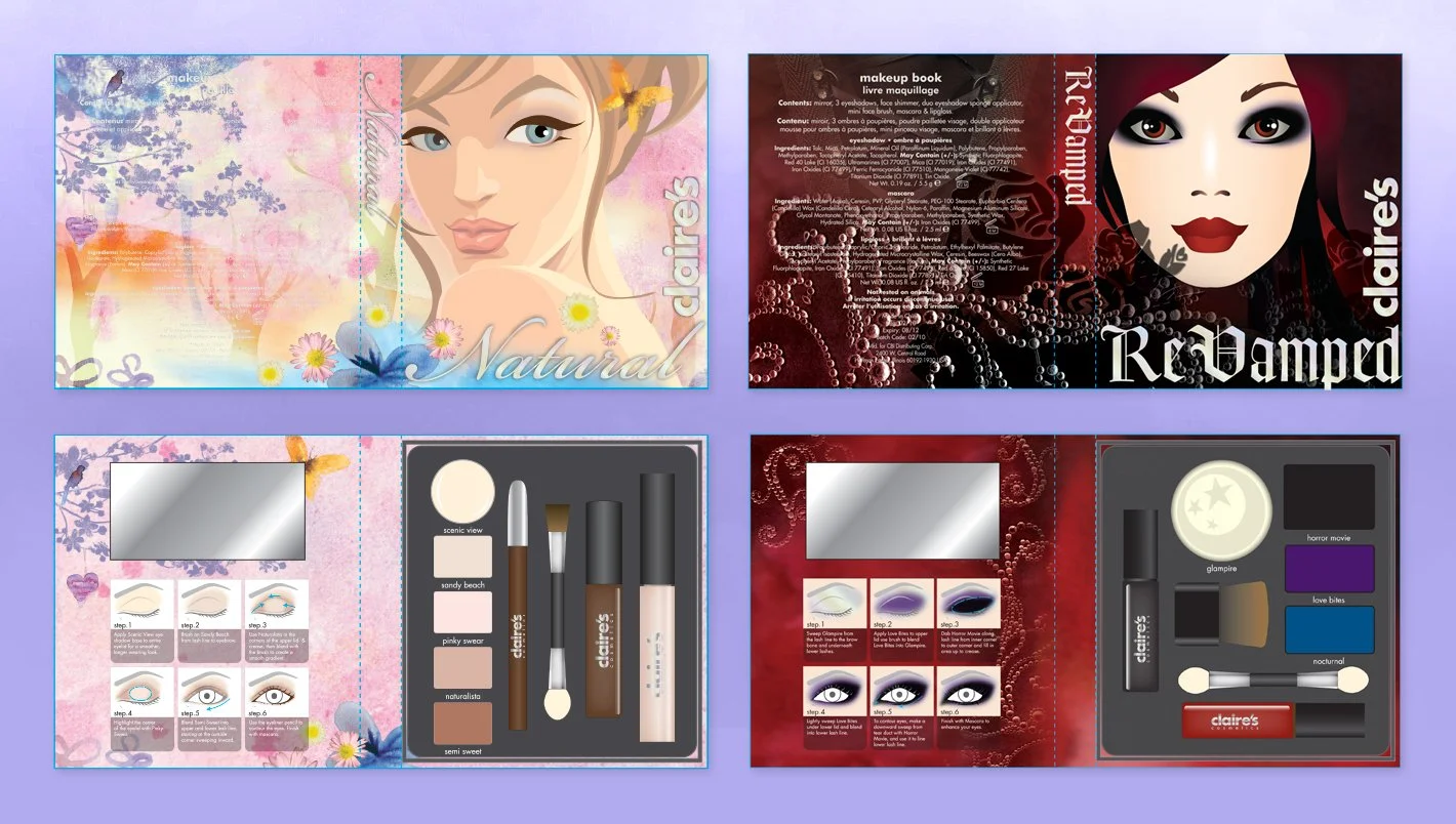 The initial request for this project was to create the Natural and Revamped palettes. To start, I conducted market research into what types of palettes our competition had in the market, and what terminology to use to describe the steps of each makeup tutorial. I landed on using stock illustration in combination with original illustration and photography to create the look of each palette. These first palettes were best sellers for multiple months in a row, prompting our cosmetics buyer to ask for additional themed palettes.
